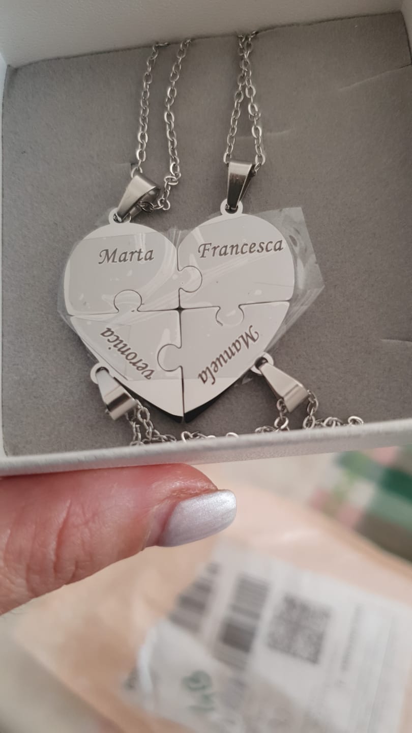 J'ai voulu surprendre ma femme pour notre anniversaire de mariage avec un collier personnalisé des prénoms de nos 3 enfants. Le résultat est magnifique ! L'acier brille vraiment bien, la gravure est super nette et le concept du puzzle qui forme un cœur est juste parfait. Elle l'a mis immédiatement et m'a dit que c'était le plus beau cadeau que je lui ai jamais fait. Franchement, je ne m'attendais pas à ce qu'elle soit aussi émue. Top qualité, je recommande sans hésiter !